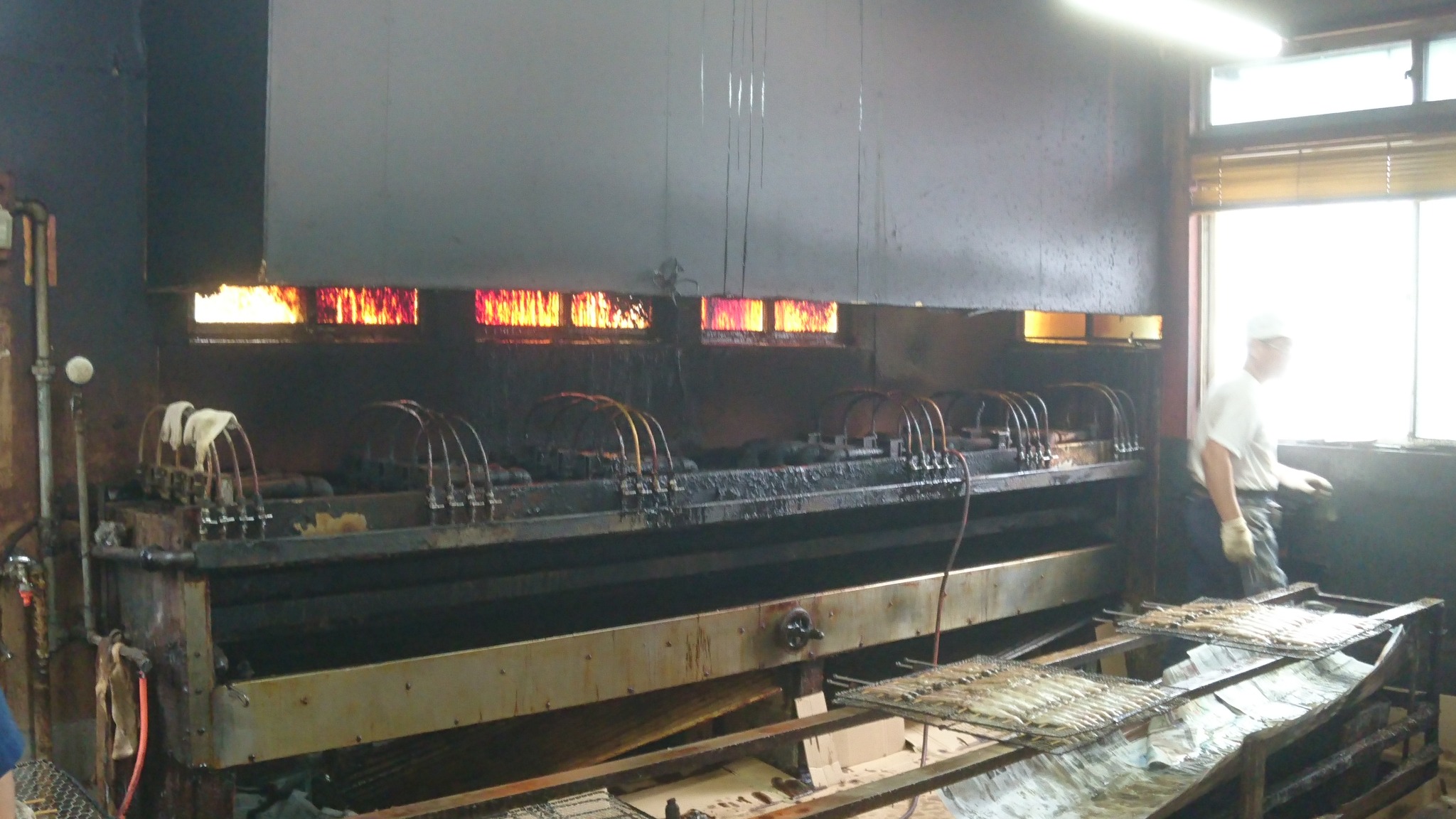 静かな加工場内に甲子園の中継ラジオが響く中、焼き機では「ジュージュー」と